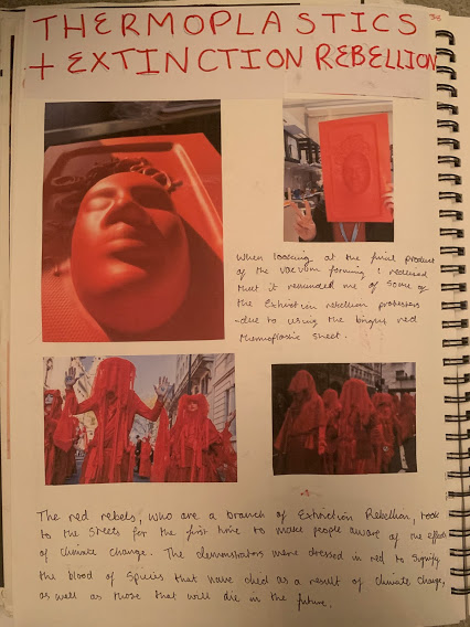 Here i have done a workshop of vacuum forming and thermoplastics. Vacuum forming is a simplified version of thermoforming, where a sheet of plastic is heated to a forming temperature, stretched onto a single-surface mold, and forced against the mold by a vacuum. Using the objects that we had we made a face of someone getting a haircut with the word trim placed underneath. When looking at the final product i realised that it reminded me of some of the extinction rebellion protestors - due to the bright red thermoplastic sheet. The Red Rebels, who are a branch of Extinction Rebellion, took to the streets for the first time to make people aware of the effects of climate change. The demonstrators were dressed in bright red to signify the blood of species that have died as a result of climate change, as well as those that will die in the future.