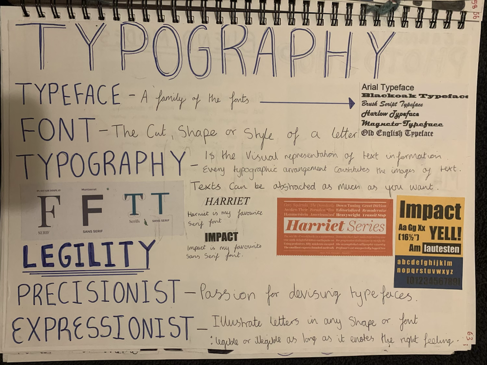 Finally i did some research on typography and chose the serif font harriet and the sans serif font impact to experiment with and practice . I also did some background research on them and harriet is a recent font from 2012 whereas impact is an older font from 1965.