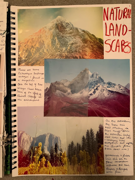 Here I have looked at some of earths natural landscapes along with what the effects of climate change may have on them By sketching it over the top of the images. I have also looked at lots of photos images to show how beautiful earth is and why it needs protection and preservation.